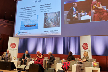 Brussels, Belgium, 10 September 2016 - People patiently and good-naturedly lined the corridors of the Brussels Bozar Centre for Fine Arts waiting to greet His Holiness the Dalai Lama as he arrived this morning for the second day of the Mind & Life conference. During the first day, presenters were mostly scientists. Today they came from more diverse fields. The panel that joined His Holiness in the Henry le Boeuf Hall this morning discussed Power & Care from the perspective of Spiritual and Religious traditions. Moderator Roshi Joan Halifax invited him to say a few words at the beginning.