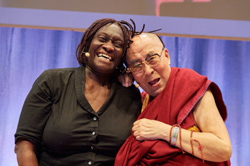 His Holiness the Dalai Lama with Theo Sowa after her presentation at the Mind & Life in Brussels, Belgium on September 10, 2016. Photo/Olivier Adam