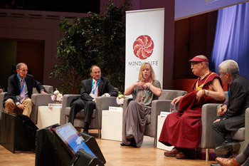 Brother Thierry-Marie Courau extolled care as listening to and serving others, which he sees reflected in the Mind & Life logo. He said we choose to love and in that to choose is to be free; that’s what will change the world.