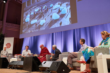 His Holiness the Dalai Lama offering his comments of the Mind & Life Dialogue in at the Bozar Centre for the Fine Arts in Brussels, Belgium on September 11, 2016. Photo/Olivier Adam