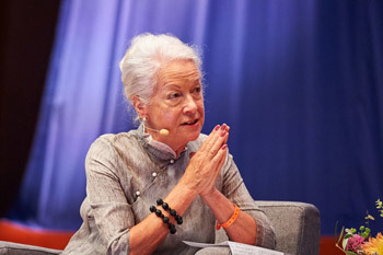 Scilla Elsworthy speaking on the final day of the Mind & Life Dialogue in Brussels, Belgium on September 11, 2016. Photo/Olivier Adam