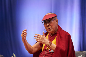 “When I meet people,” he said, beginning his talk, “I think of them as equally human beings. The way we’re born and the way we die is the same. We are brothers and sisters. Many of the problems we face today arise because we give too much attention to the secondary differences between us, instead of thinking of how we are all equally human beings. It was clinging too tightly to the idea of ‘my nation’ and ‘their nation’ to a sense of ‘us’ and ‘them’ that provoked the conflict and violence of the 20th century resulting in two World Wars. Today, in addition to climate change and the increasing frequency of natural disasters are problems that are our own creation.