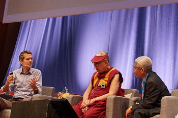 He told the large, young audience that his second commitment, as a Buddhist monk and student of the Nalanda tradition, is to encouraging inter-religious harmony. He said that India, where all the world’s major religious traditions have lived peaceably side by side for centuries is a living example that such harmony is possible. His third commitment concerns his being a Tibetan and someone in whom Tibetans both inside and outside Tibet have placed their hopes.