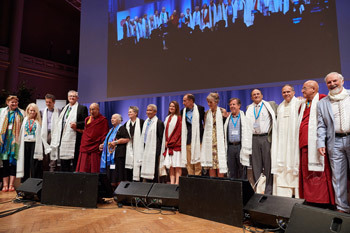 His Holiness the Dalai Lama with all of the presenters at the conclusion of the Mind & Life Dialogue in Brussels, Belgium on September 11, 2016. Photo/Olivier Adam