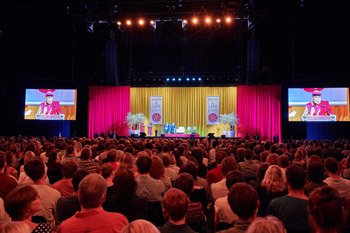 After lunch, His Holiness drove out to the Brussels Expo on the edge of the city, where 10,000 people gathered to hear him speak about ‘Individual Commitment and Global Responsibility.’ Mind & Life Europe Managing Director Sander Tideman welcomed him to the stage and requested two distinguished guests, Speaker of the Parliament of the Brussels-Capital Region, Charles Picqué and Speaker of the Flemish Parliament, Jan Peumans to introduce the event. Once they had done so, His Holiness called for chairs to be set next to his own so they could sit with him on the stage.