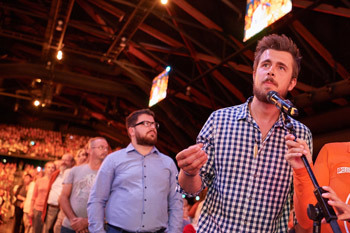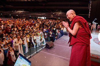 His Holiness the Dalai Lama greeting the over 3,500 members of the Tibetan community gathered to hear him speak in Brussels, Belgium on September 11, 2016. Photo/Olivier Adam