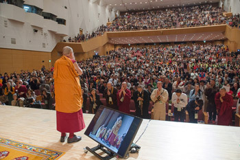 Osaka, Japan, 11 May 2016 - Arriving in the hall of the Osaka International Conference Center this morning, His Holiness the Dalai Lama walked to the front of the stage and saluted the applauding audience to the right, left and middle with folded hands.