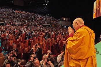 His Holiness the Dalai Lama greeting the audience of 8,800 on his arrival on stage at the Zenith Arena in Strasbourg, France on September 17, 2016. Photo/Olivier Adam