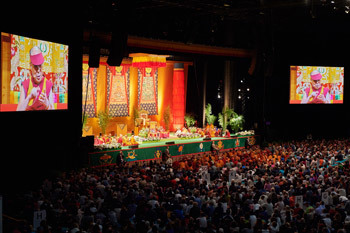 On arrival at the hall, His Holiness walked directly from his car to the stage, where he greeted old friends among the monks gathered round the throne before coming to the edge of the stage to greet the audience. He took his seat and began without further ado.
