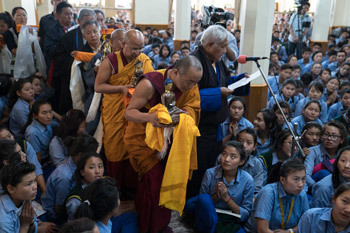 A group of senior TCV staff lined up to make offerings to His Holiness, which included images of enlightenment and 113 copies of a prayer to Amitayus, the Buddha of Longevity. In the accompanying eulogy, Ngodup Wangdu, Director of TCV, Dharamsala, recalled Avalokiteshvara’s pledge to look after the people of the Land of Snow, which has been upheld by the line of the Dalai Lamas, as His Holiness is doing now. He expressed gratitude and made wishes for His Holiness’s long life.