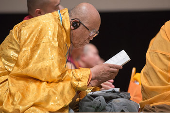A member of the audience reading along with His Holiness the Dalai Lama during the teachings in Osaka, Japan on May 12, 2016. Photo/Tenzin Choejor/OHHDL