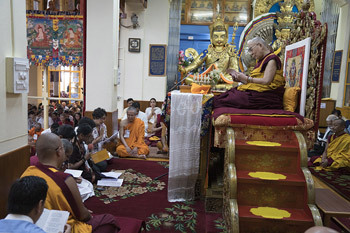 | Members of the Nalanda Shiksha chanting at the start of His Holiness the Dala Lama's final day of teachings at the Main Tibetan Temple in Dharamsala, HP, India on June 9, 2016. Photo/Tenzin Choejor/OHHDL |