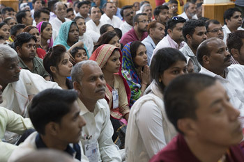 Members of the audience listening to His Holiness the Dalai Lama on the final day of teachings at the Main Tibetan Temple in Dharamsala, HP, India on June 9, 2016.