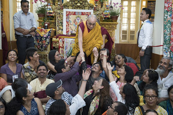 His Holiness the Dalai Lama with members of the audience from India at the conclusion of his teachings at the Main Tibetan Temple in Dharamsala, HP, India on June 9, 2016.