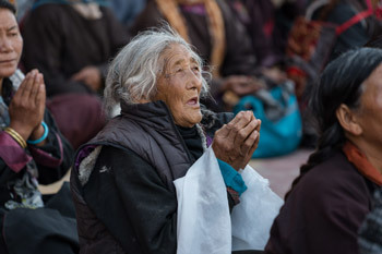An elderly member of the local community listening to His Holiness the Dalai Lama speaking at Dakthog Monastery in Ladakh, J&K, India on August 5, 2016.