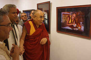 | His Holiness the Dalai Lama looking at an exhibition of photos by Vijay Kranti at the All India Fine Arts & Crafts Society in New Delhi, India on April 10, 2016. Photo/Jeremy Russell/OHHDL |