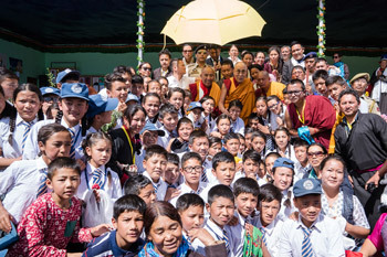 His Holiness with students and staff during his visit to Siddhartha High School in Stok, Ladakh, J&K, India on August 8, 2016. Photo/Tenzin Choejor/OHHDL