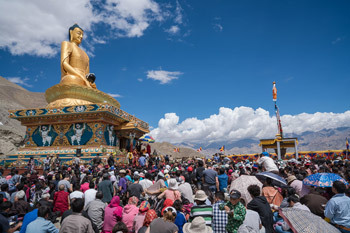 Members of the community gathered to listen to His Holiness the Dalai Lama speak at the newly constructed statue of Shakyamuni Buddha in Stok, Ladakh, J&K, India on August 8, 2016. Photo/Tenzin Choejor/OHHDL