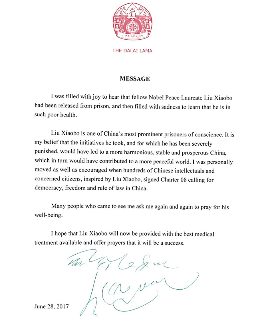 I was filled with joy to hear that fellow Nobel Peace Laureate Liu Xiaobo had been released from prison, and then filled with sadness to learn that he is in such poor health.
