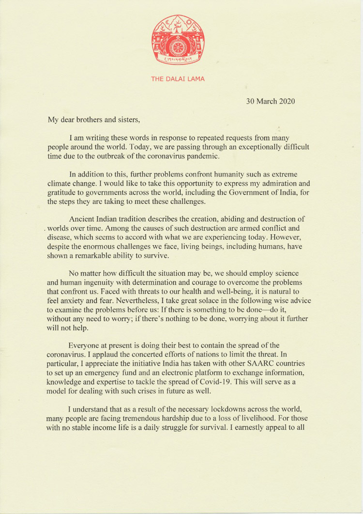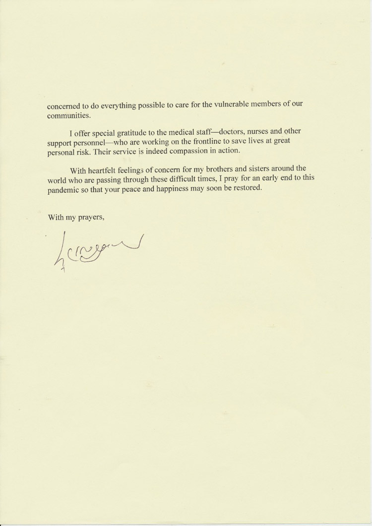 With heartfelt feelings of concern for my brothers and sisters around the world who are passing through these difficult times, I pray for an early end to this pandemic so that your peace and happiness may soon be restored.
