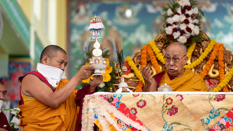 Tashi Lhunpo Monastery, Bylakuppé, Karnataka, India - Today, His Holiness the Dalai Lama was to give a Long-Life Empowerment based on White Tara, the Wishfulfilling Wheel, entitled ‘A Stream of Nectar of Immortality’ in the debate yard of Tashi Lhunpo Monastery. The ritual was composed by Takdak Rinpoché, Ngawang Sungrab Thutop, who was His Holiness’s Regent and Tutor.
